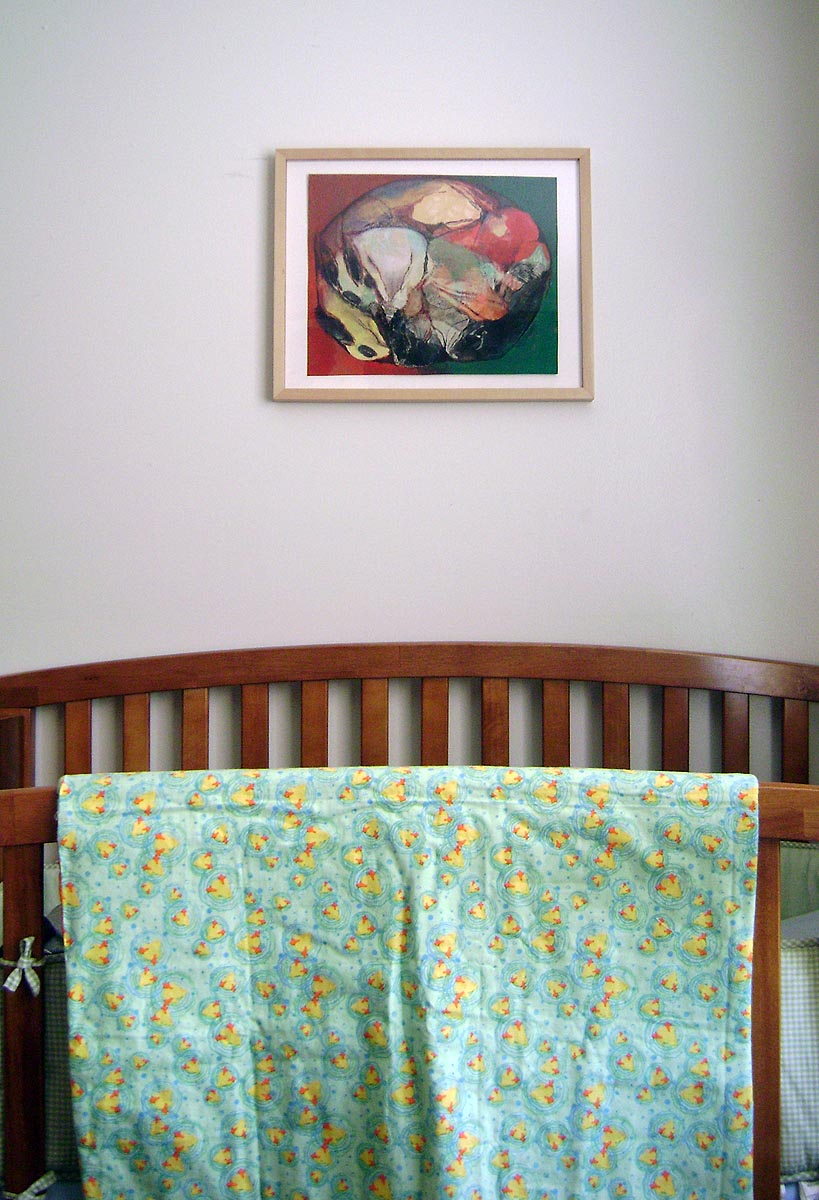 I know Jen from grad school. She was such a strong presence at IU; her paintings and intelligence both intimidated and awed me during my time there. I’m glad we have continued to communicate over the years and I love that her’s will be among the first art Miranda will see.