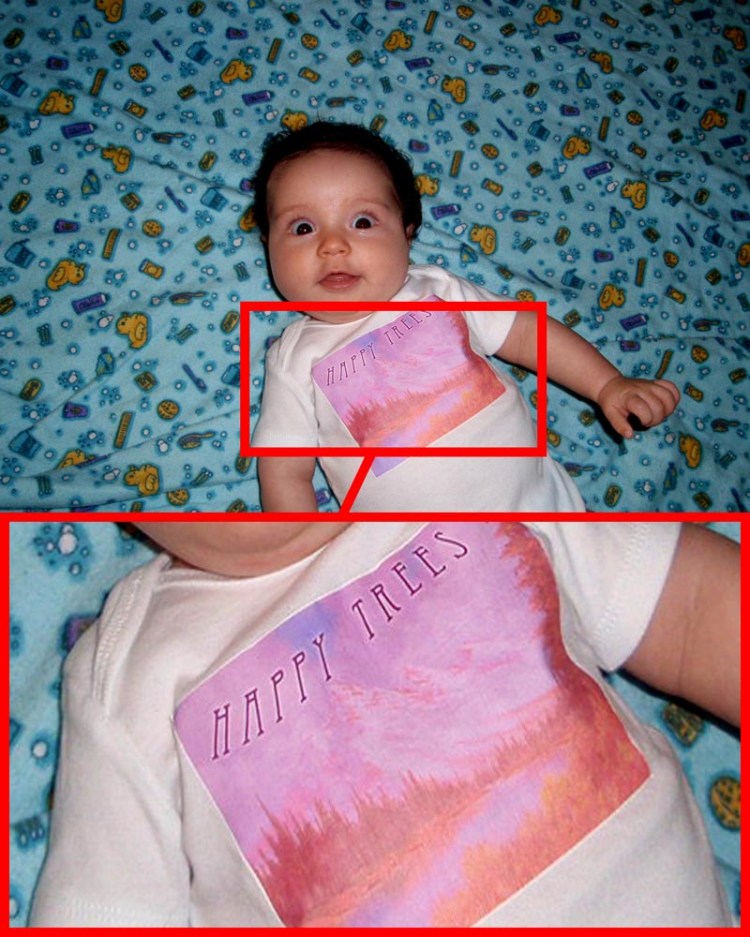 Miranda and the Happy Trees Posted on August 1, 2010 by matt ballou under Life A friend of ours made a few onsies for our daughter Miranda. Today she was big enough to fit into the Bob Ross themed, “Happy Trees” one. Here are a few pics of her in it. :) Rate this:Share this: Click to share on Facebook (Opens in new window) Facebook Click to share on X (Opens in new window) X Like Loading... Related