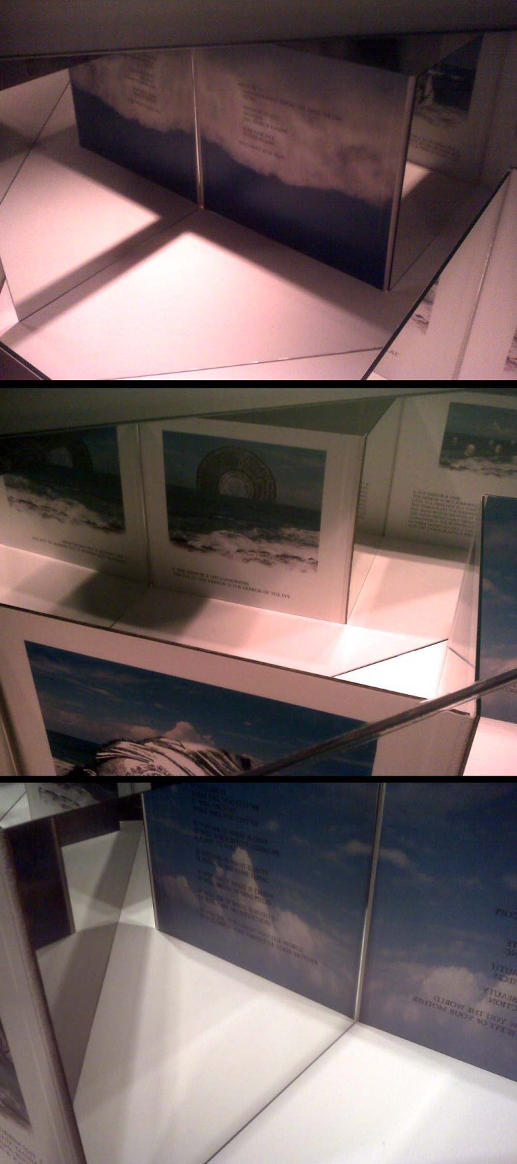 Last week I was in Louisville, KY for my show at the 930 Art Center. While in town I took a drive to 21C, a contemporary art space situated in a posh hotel. 21C blew my mind, but there was one work in particular that I spent a good deal of time with: Sandra Ramos’ Unknown (The Mirror Poems – Toi Derricotte). The work, an installation of image and text on vinyl and using mirrors and inverted imagery, is very beautiful and evocative. Here are a few shots of the work in situ, but be sure to click the link above to learn more.