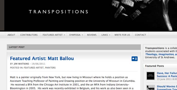 Transpositions is a collaborative effort of students associated with the Institute for Theology, Imagination, and the Arts at the University of St Andrews in Scotland. The site has vibrant discussions going on among PhD students and post-graduate commentators (as well as contributors from around the globe) on a variety of topics. If you’re interested in the intersection of Art, Theology, and intellectual inquiry, I suggest you check them out.