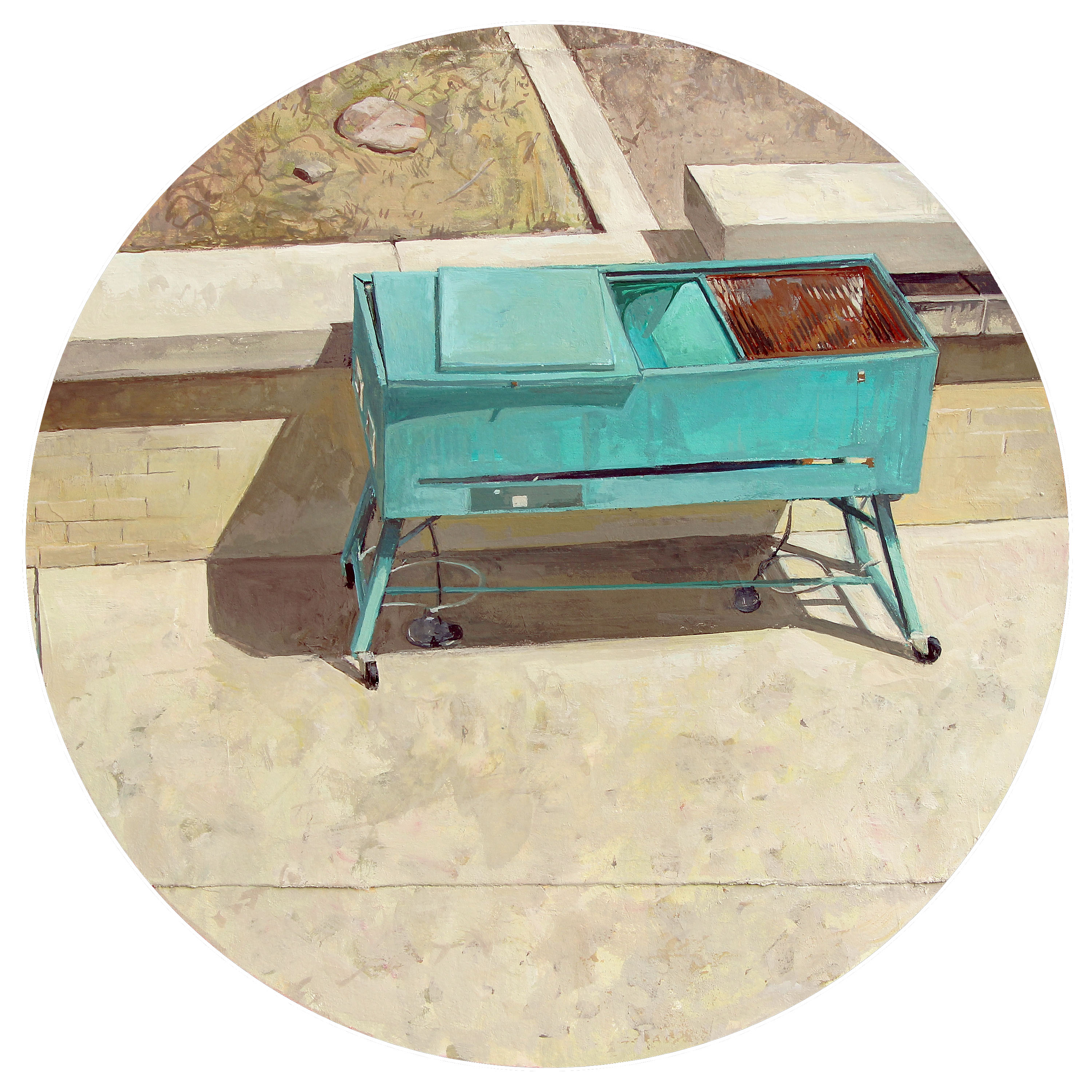 I’ve been looking at this teal grill for the last six months or so. It’s situated in a little courtyard common area for students who live in nearby residence towers here at the University of Missouri. A few months ago when I moved into my new office/studio space I became even more enamored with this thing. It’s awkward. It’s got a glorious, alchemical color that changes with the weather. I’ve never seen it being used, and yet it’s got a presence and sort of commands a section of the courtyard wall. Situated on an East-West axis, the sun gives the grill a dramatic polyhedral shadow that tracks out, under, and around its gangly legs. Vaguely alien, dingy and unused, and having physical proportions and angular relationships that allow for formal play, it was only a matter of time until I painted it. The exploration was worth it… I might have to dive right back in.