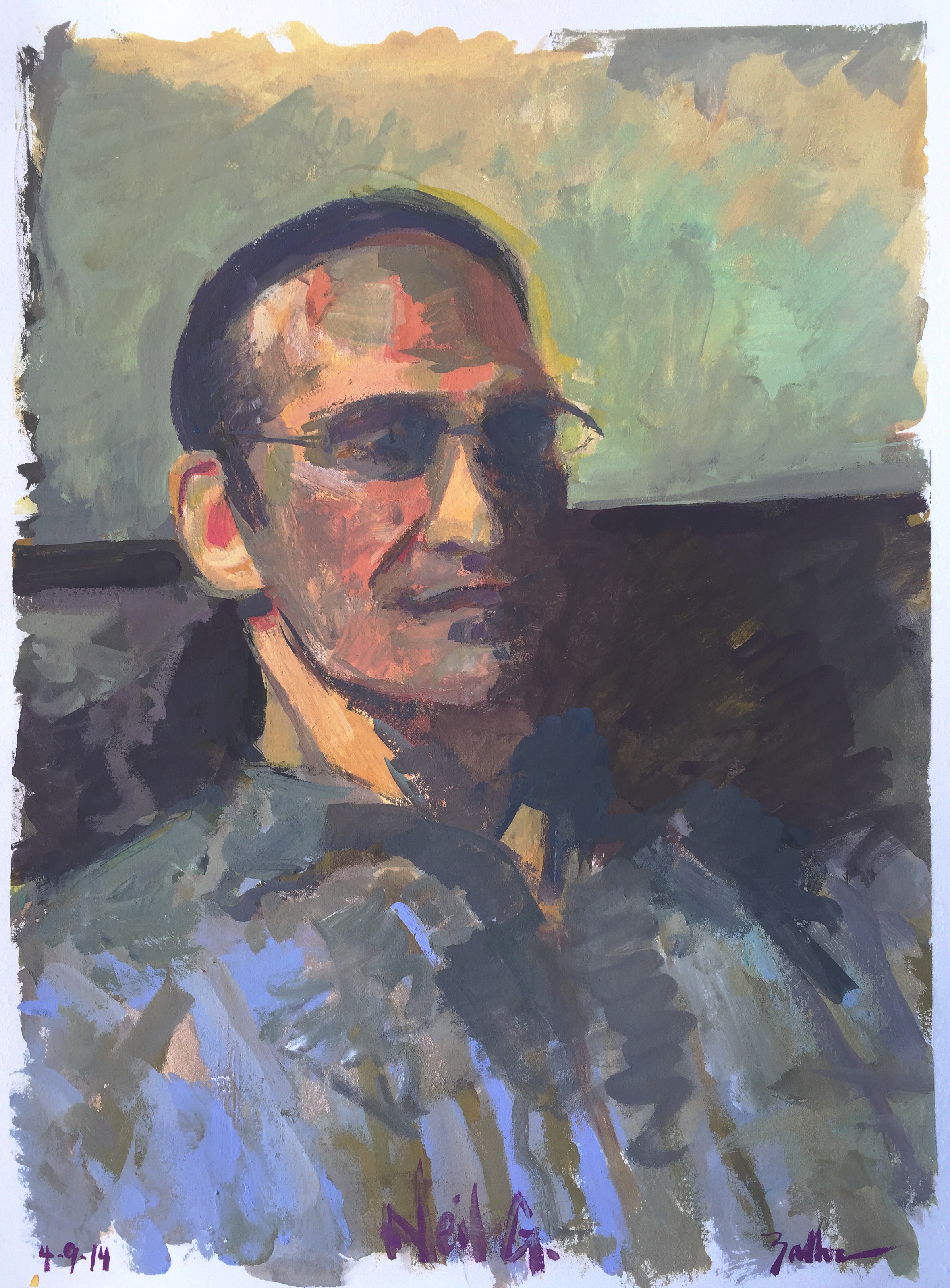 neil2014image1Portrait of Neil Gavett: Another Day, Another Dangle. Gouache on paper, 14×11 inches, 2014.