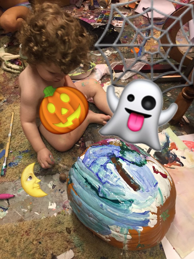 Atticus loved drawing in where to put the eyes and mouth for me to carve. Then I let him unleash the paint…
