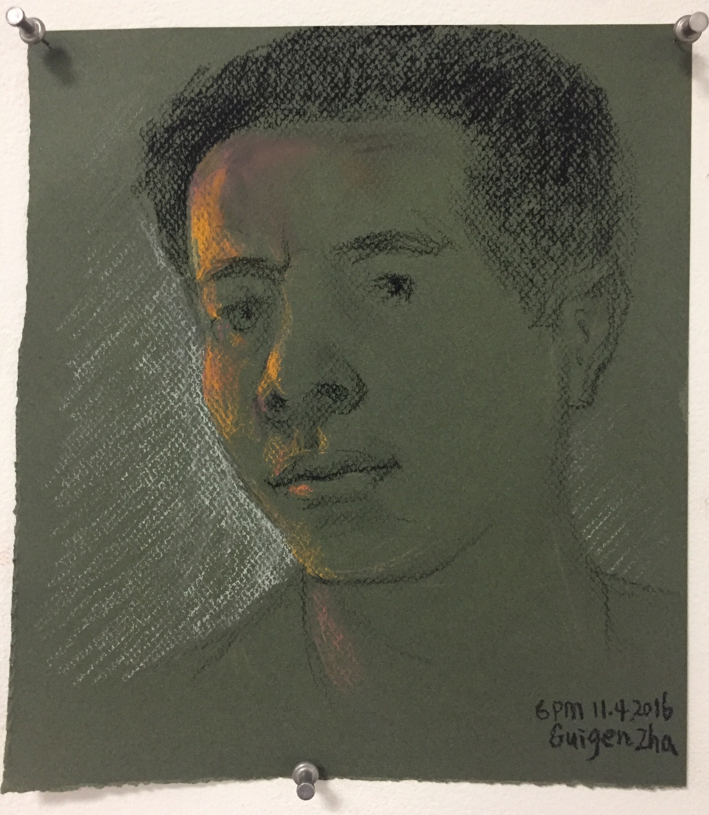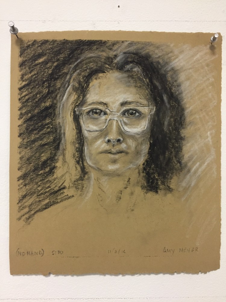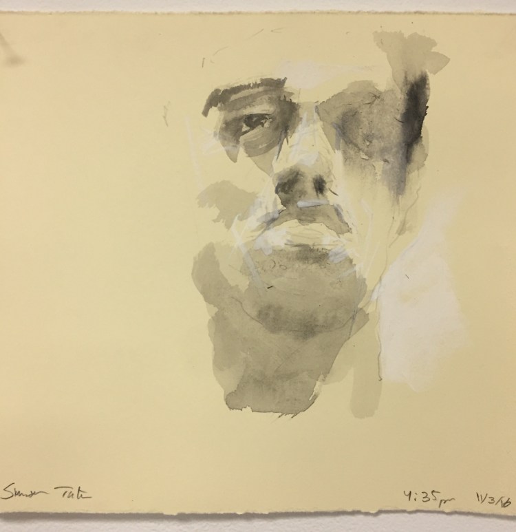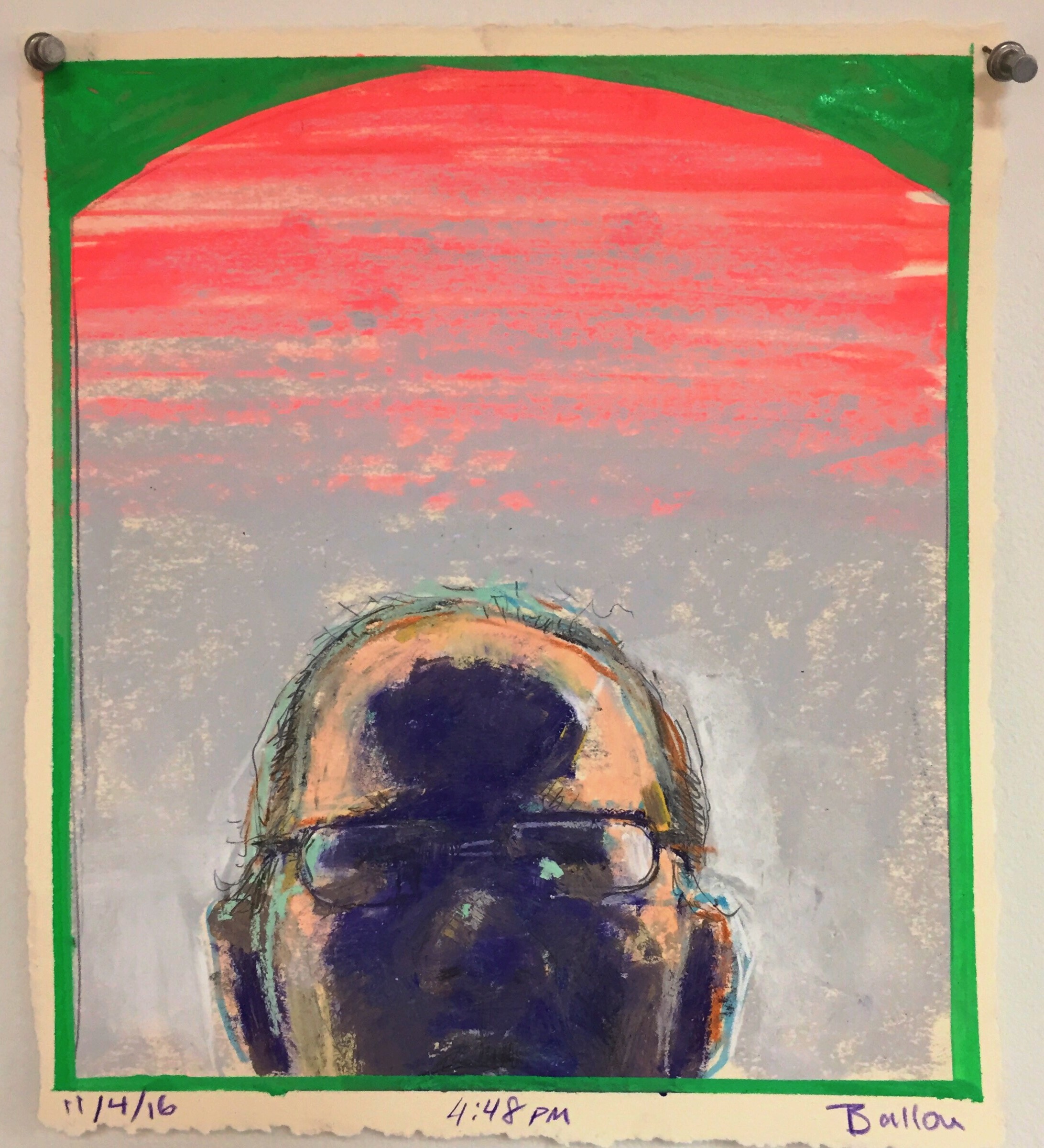I focused on the abstract shaping of my head foreshortened in a mirror. The strange roundness of my neck was compelling; these are some of the first self-reflective observational/figurative works I’ve made since my heart attack in February.