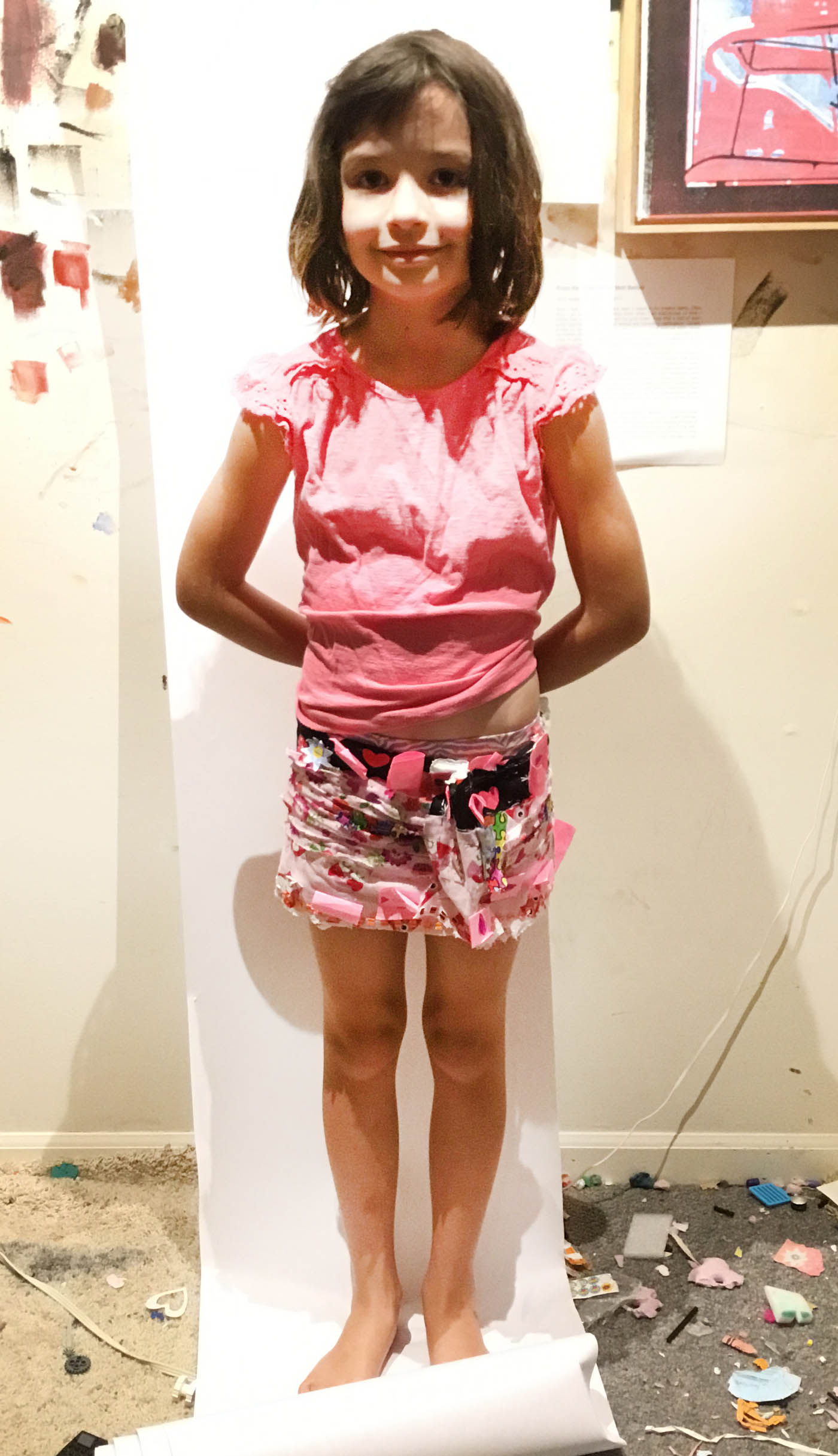 The front side is pictured here on the left. The verso is on the right. When I was taking these photos she was annoyed that I wanted to take a picture of the back, but it’s amazing. She’s using staples to hold layers of various fabrics, paper, adhesive stickers and sheets, as well as post-it notes and tissue paper together. When hanging, she says it’s titled The Straightened Skirt. In this form it’s about 50 by 10 inches in size. Here’s Miranda modeling it in skirt mode: