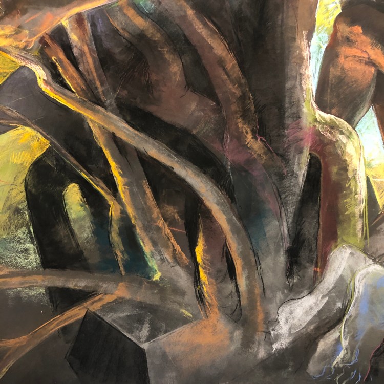 The exhibition features older work based in personal and spiritual conflict. One such piece is from 2001, created along the eastern shore of Lake Michigan amid the reverie of a pre-social-media world. A number of the large drawings were begun in 2006 and 2007 behind the apartment we rented on Elmwood Avenue in Evanston, Illinois. Little did I know then that those works would find their completion more than a decade later in Mid Missouri after many iterations.