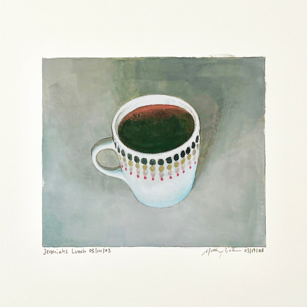 I worked at Good’s with an amazing cast of characters: Ronnie Boykin Junior, David Gracie, Micah Ebbe, Fred Sturkey, and so many others. One of the people there was Jeremiah Ketner, a man who has gone on to a long and fruitful art career. One day I saw Jeremiah’s coffee cup and we mused together about coffee sometimes being a main meal during the work day. I decided to paint a view of his so-called lunch.