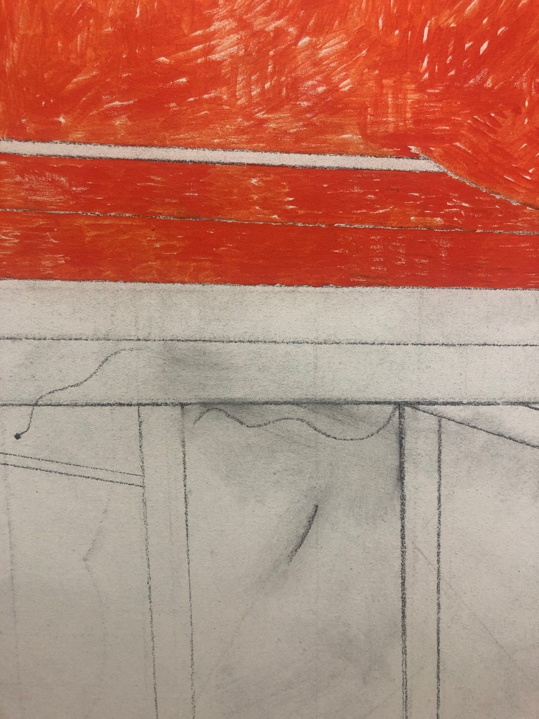 Another wonderful moment in this painting is show in the detail below. The spatial interplay between the gray-blue ribbon/band form and the red-orange rectilinear box shape is astounding. The choreography taking place here is so precise and poetic, and the eye bends and twists around the piece, flipping from surface to space to, from edge to texture. Miyoko Ito leads us in an unnameable spatio-temporal dance.