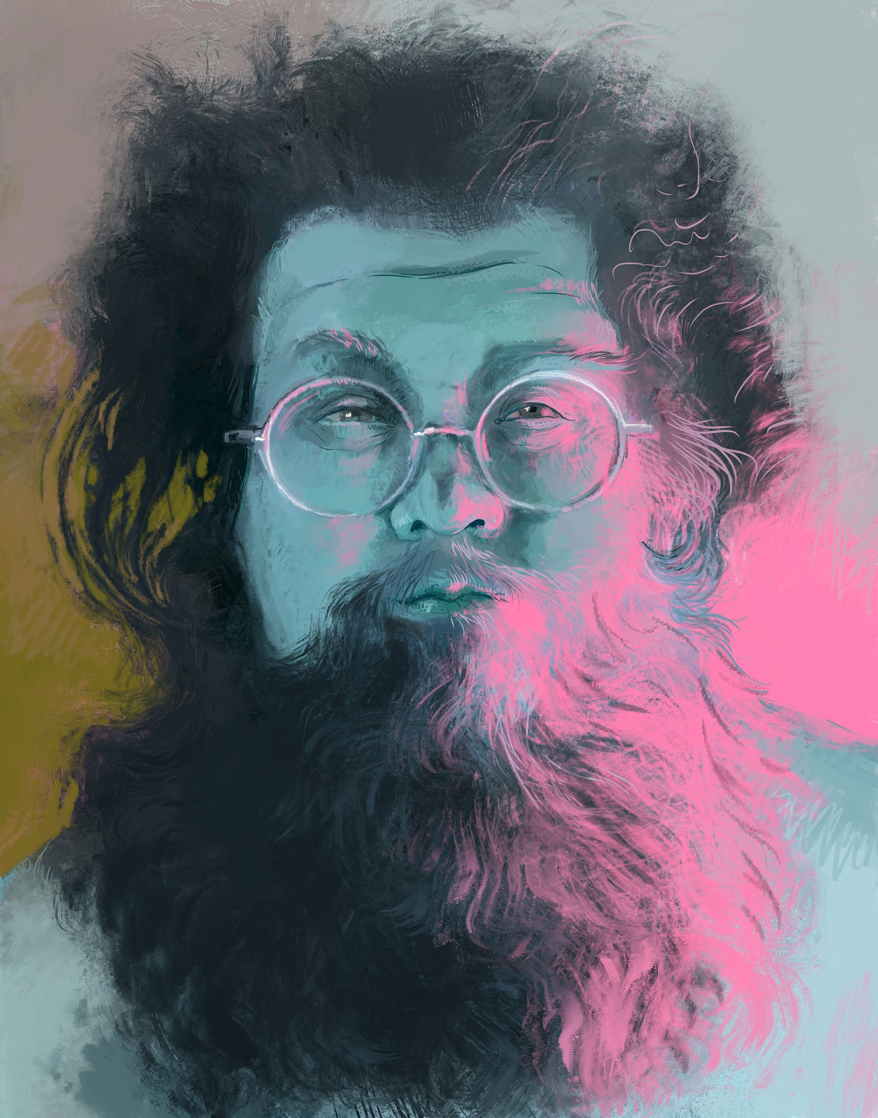 David: He would pile it on and then sand it off – power sand – the surfaces down. He worked in a barn, too. You can see it in the other room (featuring unfinished works), like, different stages of development. Also, on this Gillespie (portrait) in this room.