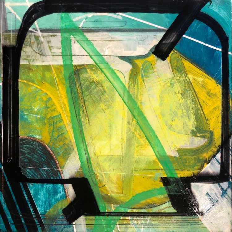 All pictured works are 8×8 inches and mixed media (mostly, oil, acrylic paint, alcohol inks, spray paints, various permanent markers, and varnishes or polyurethanes) on wood panels. All were created beginning in 2017 and completed by 2020.